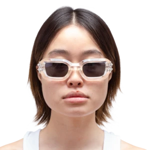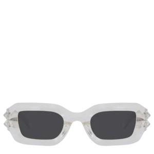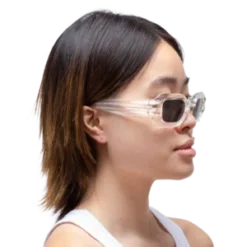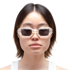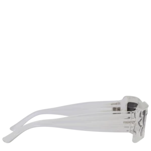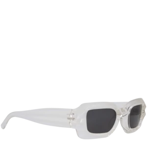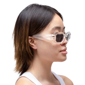 BOLU GLACIAL are unisex sunglasses featuring dual ridge temples and black lenses with polarized lenses that offer 100% UV protection. The glasses are produced in a transparent clear frame with extra durable barrel hinges.