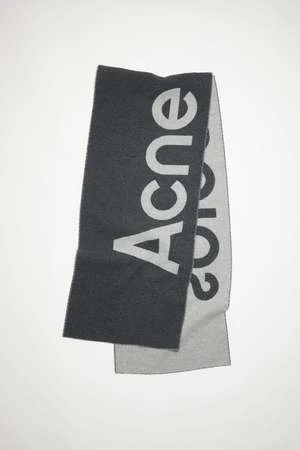 Acne Studios grey/light grey logo jacquard scarf is made of a wool blend with frayed edges. 200 cm x 38 cm.