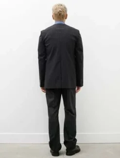Trim fitting straight leg suit trousers cut from a blended poly / wool worsted pinstripe in charcoal grey. Feature a zip fly with a two-point closure, front slash pockets, rear button closure welt pockets, and low profile waistline for a clean formal fit. The straight leg falls subtly away from the body through the lower leg while a closer fit through the seat creates a sense of elegance. Constructed with added seam allowance through the seat and a generous blind hem that can be let out if additional volume or length is needed; finished with a half lining to the knee for improved comfort.