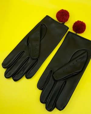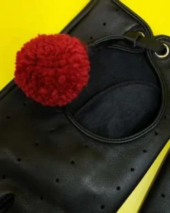 Black & Red Lamb Leather Pom Pom Gloves.