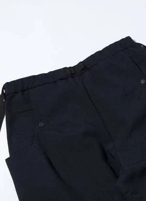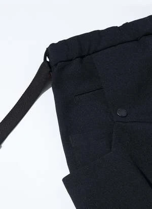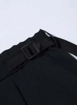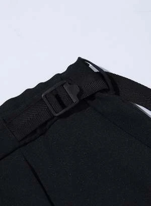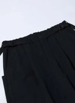These are cropped bottoms featuring a double waist buckle. The silhouette is a mix of tapered and balloon styles with a single pleat to create room around the hips. They have spacious back pockets.
