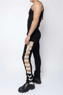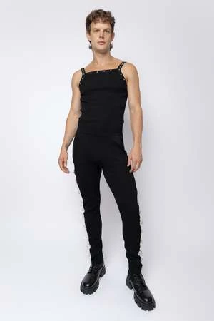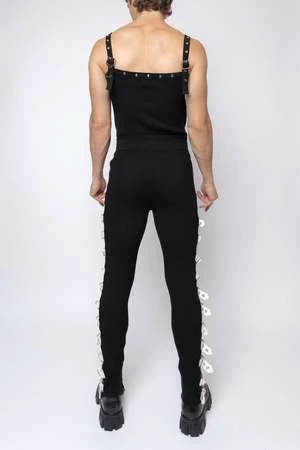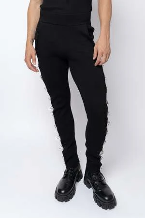 Mid to high-rise knitted pants crafted of a smoothing rib with an elastic waistline. Featuring eyelet buckle industrial hardware closures at the out seam, allowing adjustment for a more tailored and personalized fit and a sensual peekaboo effect.