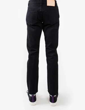 From Han Kjobenhavn, classic stonewashed Japanese Kaihara selvedge denim dyed in black. A slim tapered fit through the leg with a regular waist. Features full front button closure, branded natural leather patch, classic 5 pocket jeans, branded antique rivets, and a smooth but sturdy feel.