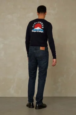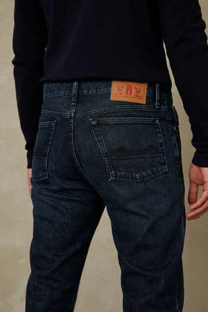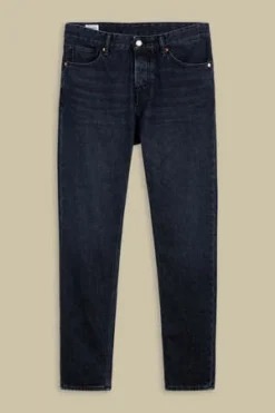 Tapered five pocket jeans with a long rise. Non stretch. Classic tapered silhouette. Button fly closure. All recycled metal trims. Pocketing from organic cotton and recycled plastic bottles. Vegan brand patch on the waistband. This garment is made with organic cotton, a natural fiber with no chemical treatment making it safer for the planet, farmer and wearer.