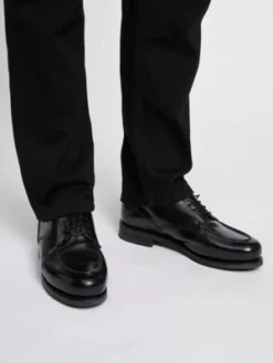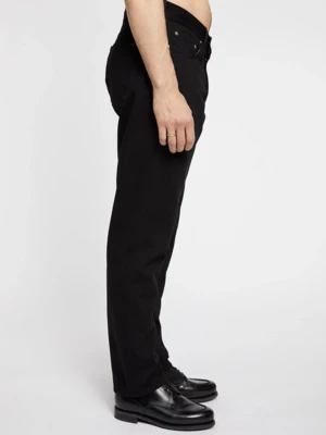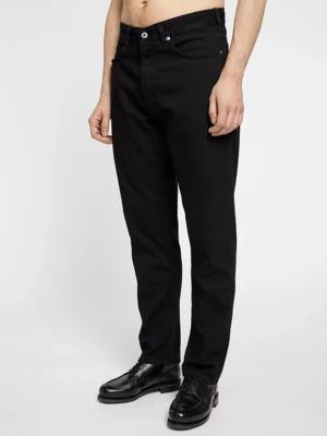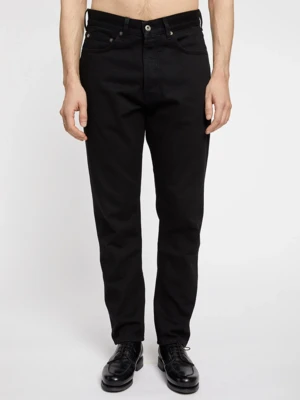 High rised, fitting precicely and narrow in the waist, and curved into the lower back. Spacious thigh that taperes down to a slimmer leg opening.