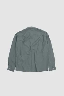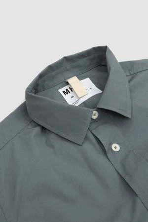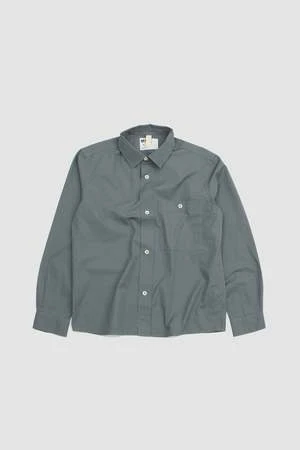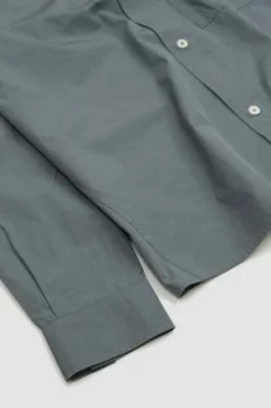 Cotton poplin overall shirt. Boxy cut. Patch pocket with pen pocket detail. Straight cuff. Side split hem.