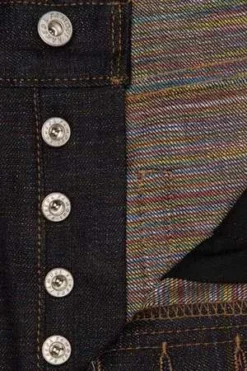 The Japan Heritage Kasuri is a 14.5oz Japanese selvedge denim with a colorful Kasuri-dyed weft interior. The cotton weft yarns are laid out lengthwise and dye is applied in sections perpendicular to the length of the yarn. The result is a single strand of yarn with a gradient of colorful tones throughout. This is then combined with a slubby rope-dyed indigo warp and slowly woven on vintage shuttle looms at a low tension in such a way as to create an uneven organic texture, reminiscent of hand-woven fabrics. Cut, sewn, built in Canada with contrast stitching, vintage pink line selvedge ID, vegetable tanned leather patch, and silver metallic buttons and rivets. This style features a button fly.