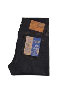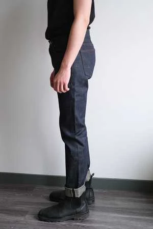 The Perfect Blue Slub Stretch Selvedge is a 12.5oz Japanese selvedge denim with an uneven, bumpy surface texture. To achieve this, the denim is slowly woven on vintage shuttle looms woven using irregular sized slub yarns which are thick in some parts and skinny in others. The result is an uneven, organic grain in the denim reminiscent of hand-woven fabric. The traditional indigo tone was produced through rope dying using pure indigo, a chemically perfect form of the dye. This is paired with a beige cotton weft interior. The denim is slightly rigid and contains 2% stretch for added comfort and reduced break-in time. Cut, sewn, built in Canada with contrast stitching, classic redline selvedge ID, vegan-friendly apple leather patch, and silver metallic buttons and rivets.