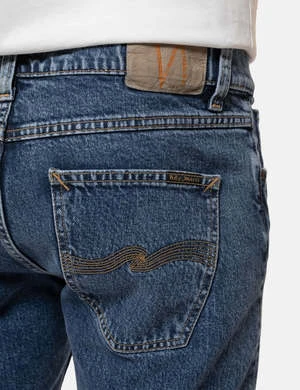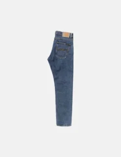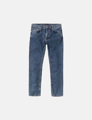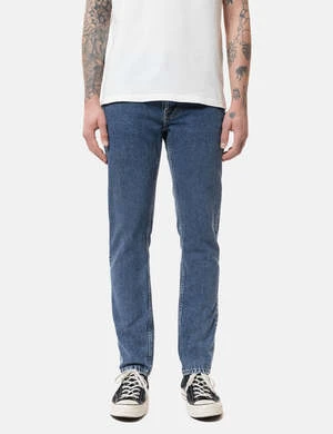The Lean Dean Jeans from Nudie Jeans Co. are slim fit jeans with a tapered leg in a clear-blue, salt, and peppery wash. Crafted from organic comfort stretch denim.