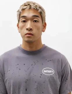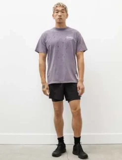 A classic fitting short sleeve t-shirt cut from a lightweight, high density, organic cotton jersey in a faded purple with irregular “sun bleached” detailing. The dry hand of the fabric offers a natural absorbency that keeps you dry while the “moth-eaten” treatment mapped to the natural contours of the body adds ventilation, increasing air exchange to keep you cool. Features a front logo graphic at left breast and a concealed, internal key / coin pocket at the back right hem. Finished with shoulder-to-shoulder taped seaming at the back neckline to provide a smooth interior surface and reduce abrasion at frequent wear point; reflective logo print at the rear right shoulder for increased visibility.