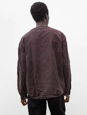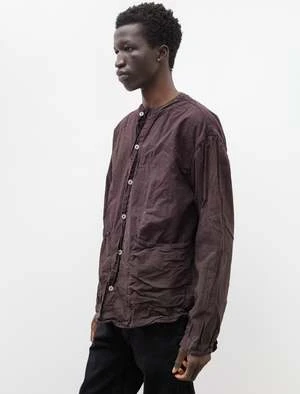 A generous fitting button front over shirt cut from a lightweight cotton calico that has been dyed using a reactive dye method to a rich purple tinged brown. Features a collarless neckline finished with an exposed facing, two patch pockets at the waist and a gently curved hem. The roomy chest accompanied by a subtle drop shoulder make for a dynamic silhouette that responds well to movement. Constructed with Tender’s trademark attention to durability using chain stitched flat felled seams throughout for a hard wearing finish that is built to last; hand cast pewter buttons.