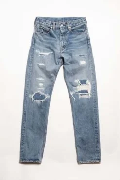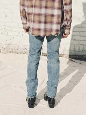 Relaxed Fit Grunge Denim with destroyed holes and repair details, flat and logo original rivets produced by END CUSTOM JEWELLERS are used for the front and back pocket sides. The fabric is 13oz uneven thread denim, which is not bleached at once with a bleaching agent, but is slowly discolored with stone wash, shaving gives a beard look, and further wash is applied to create a denim with a more vintage look