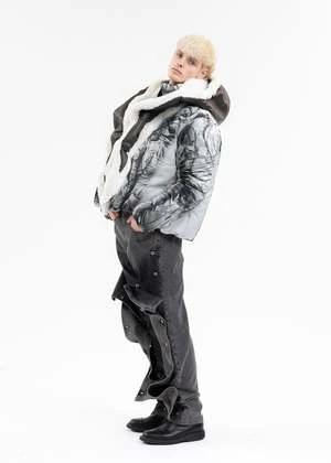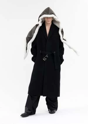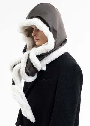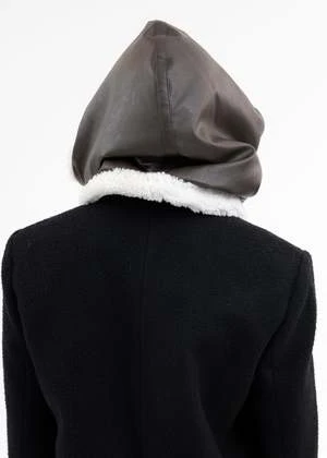 Leather shearling-lined hood in brown. Paneled construction with integrated wire structuring along the length of the collar. Tonal stitching throughout.